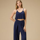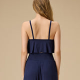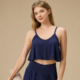 - 雙層式設計,內層為固定式襯墊運動內衣,外層為波浪荷葉。